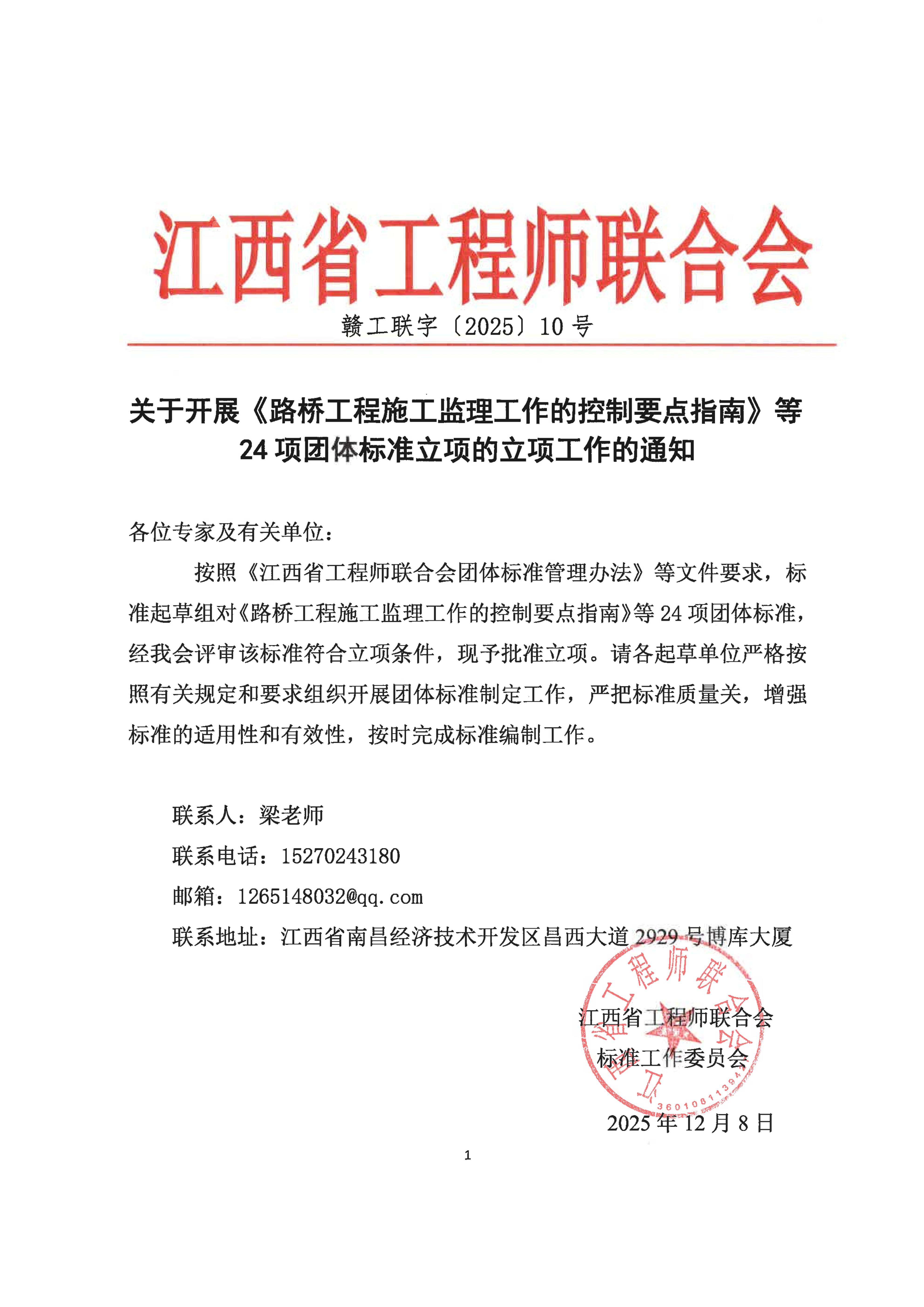 关于开展《路桥工程施工监理工作的控制要点指南》等24项团体标准立项的立项工作的通知