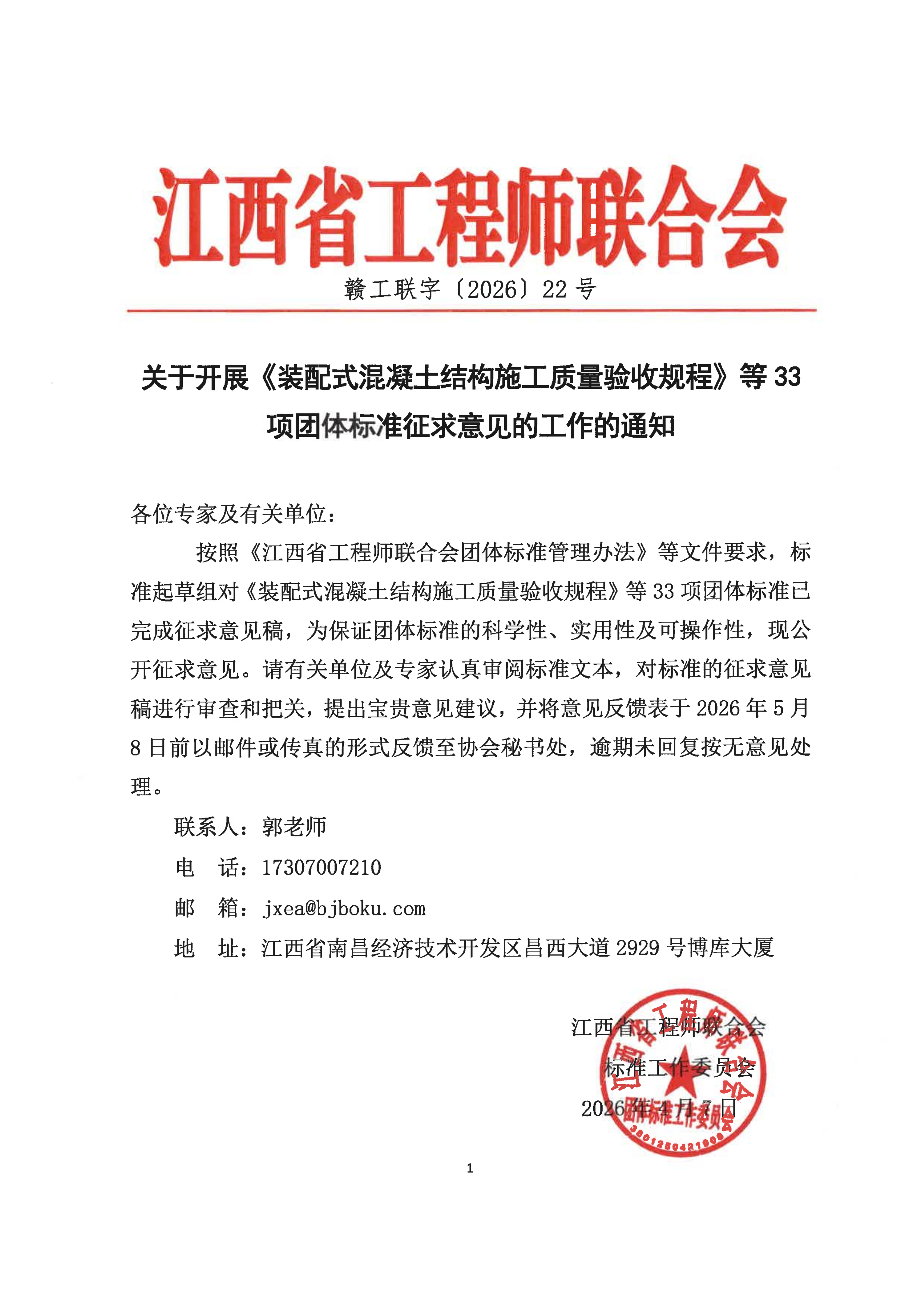 关于开展《装配式混凝土结构施工质量验收规程》等33项团体标准征求意见的工作的通知